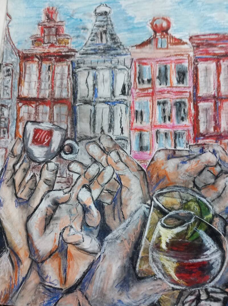 Nieuwmarkt, 2022, 38x27cm, mixed media, prijs bij opvraag